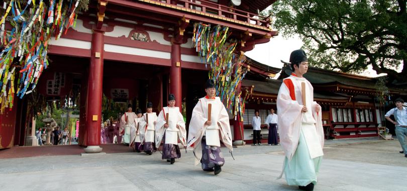 祭祀被成為日本學問之神的菅原道真的全國天滿宮的總本宮。公元901年,右大臣菅原道真突然被貶至太宰府為役人,兩年後客死於此,後在其墓地上修建了現在的天滿宮,1591年修建了現在的本殿,已被指定為日本國家重要文化遺產。
