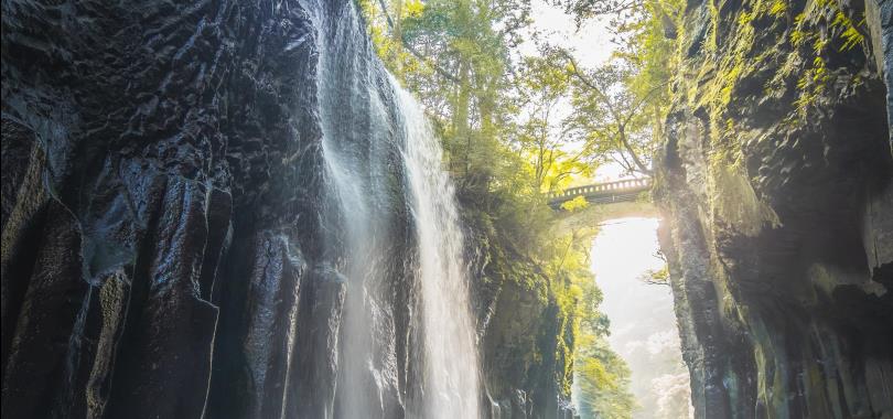 高千穗峽是五瀨川侵蝕阿蘇熔岩而形成的 V 字形峽谷,兩岸沿途是略帶紅色的安山岩絕壁。最值得一看的是翻騰著白色飛沫、從高達 17 米斷崖飛瀉而下的真名井瀑布。峽谷沿途建有約 600 米的徒步遊覽路,一年四季可以觀賞不同景色。