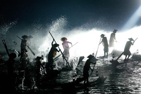 舞臺為兩公里的灕江水域及十二座背景山峰,構成世界最大的天然劇場,將劉三姐的經典山歌、廣西少數民族風情、灕江漁火等許多元素組合,不著痕跡的溶入山水,還原於自然,成功詮釋了人與自然的和諧關係,創造出天人合一的境界。