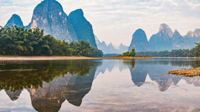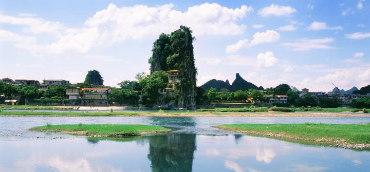 灕江猶如山水墨畫、沿途美景舉世聞名。晴天,看青峰倒影;陰天,看漫山雲霧;雨天,看灕江煙雨;陰雨天,但見江上煙波浩渺,群山若隱若現,浮雲穿行於奇峰之間,雨幕似輕紗籠罩江山之上,活像一幅幅千姿百態的潑墨水彩畫。