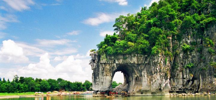 因整個山形酷似一頭駐足漓江邊臨流飲水的大象而得名,簡稱象山。象山海拔220米、長108米,高出水面55米,由3.6億年前海底沉積的純石灰岩組成。象鼻山是桂林山水的代表,桂林城的象征,桂林乃至廣西地方產品多以象山作為標記。