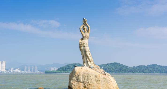 漁女是珠海的標誌性雕塑,這座雕塑高達約9米,由花崗岩雕刻而成,形象是一位美麗的漁女手捧珍珠,象徵著珠海的名字和漁業傳統。珠海漁女不僅是城市的象徵,也吸引了眾多遊客前來觀光和拍照,成為當地的重要地標和旅遊景點。