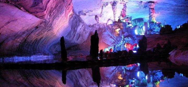 天宮岩第二絕:洞中因地下水沖刷,而形成無數個平靜如鏡的水池,光彩絢爛的鐘乳石倒映其中,到有了「鏡中花水中月」的夢幻感,精彩度不輸給九寨溝。第三絕:洞中有一處因地下暗河穿岩壁而過,在落差處形成一處高十米、寬二十餘米的巨大溶洞瀑布-聖泉瀑布,十分罕見獨特。