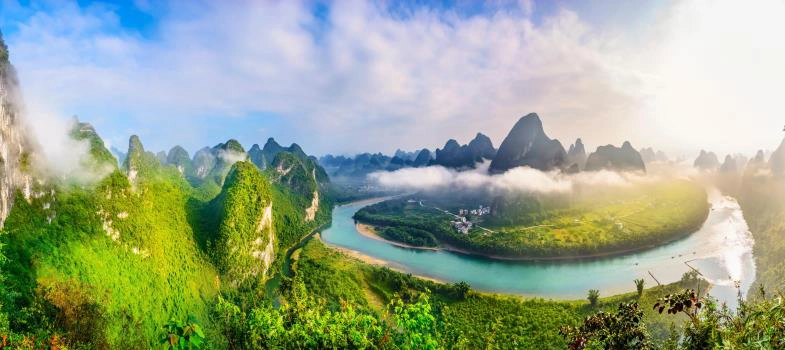 遍佈的峰林因為灕江的「山環水繞相依」讓桂林的景致呈現出別處峰林所沒有的清冽飄逸,就是這種清幽秀美的意境氛圍,令人無法忘懷灕江的美,不論是晴空萬里時的俊秀清新;煙雨濛瀧時的空靈飄渺,皆吸引著古今中外無數人士想前往一親芳澤。當乘船於灕江之上,穿行於灕江兩岸造型變幻莫測的峰林間,猶如置身百里畫廊,充滿「舟行碧波上,人在畫中游」的詩情畫意!