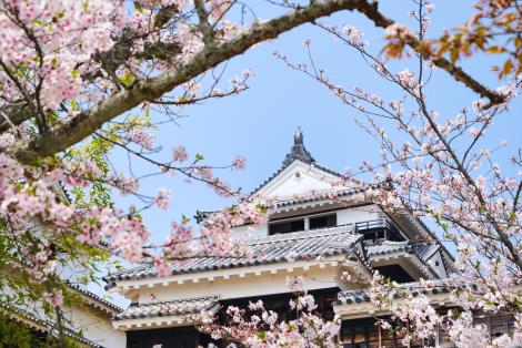 愛媛松山市的象徵「松山城」是日本國內「現存天守」之一,城內的12座建築物被列為日本國家重要文化財。春天時周圍的城山公園約有200株櫻花綻放,以松山城為背景或是登上天守閣,可以欣賞到不同角度的櫻花美景。