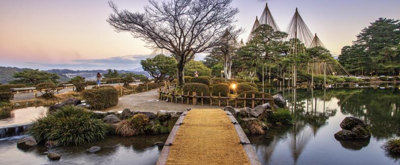 《金澤兼六園》不同於日本庭園常見的枯山水風格,引自十公里外犀河的人造溪流充滿著水泉的活力,環繞整座園區,加上以大約五百棵樹齡超過百年的古樹為中心,春季賞櫻、夏季杜鵑、秋天紅葉、冬季雪白,四季景觀變化多端。