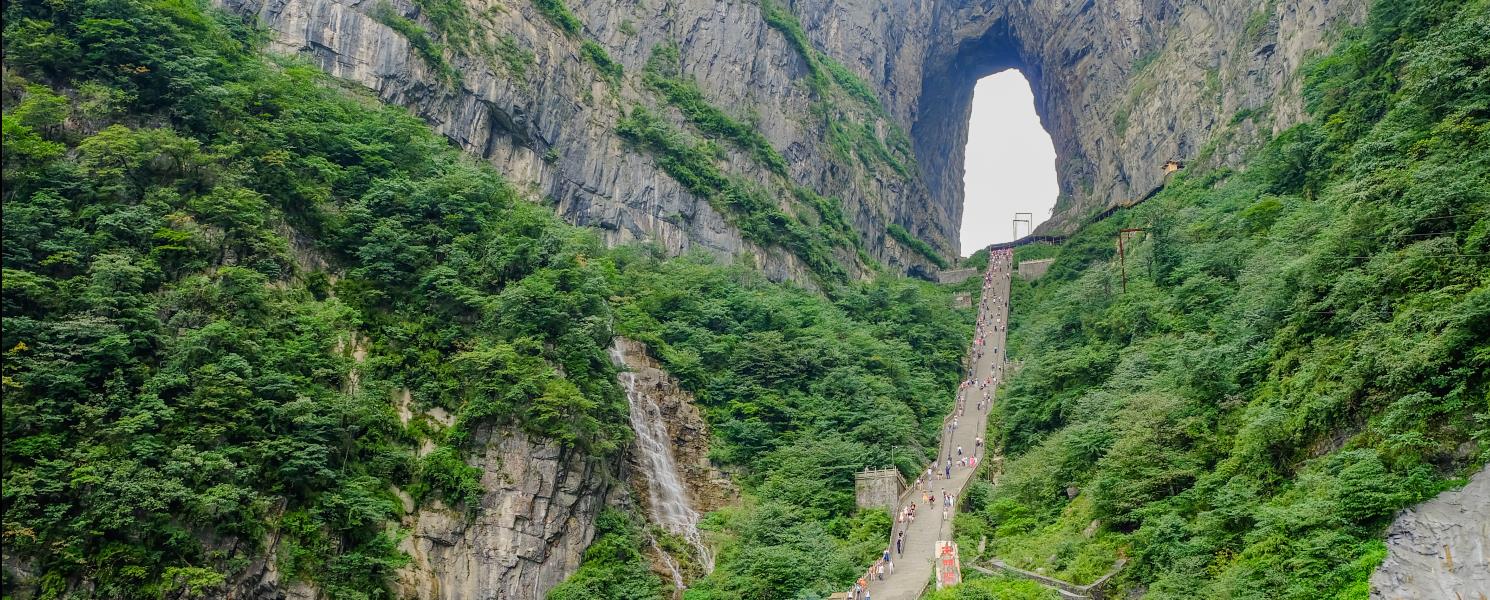 是世界上最高的天然穿山溶洞,門洞高131.5 米、寬57 米、深60 米,它宛若一扇通向蒼穹的天然天門,雄偉而神秘。晨間雲霧繚繞中洞口忽現、忽隱,猶如“天門吐霧”,夕陽映照時又呈“天門霞光”,變幻莫測、如夢如幻。