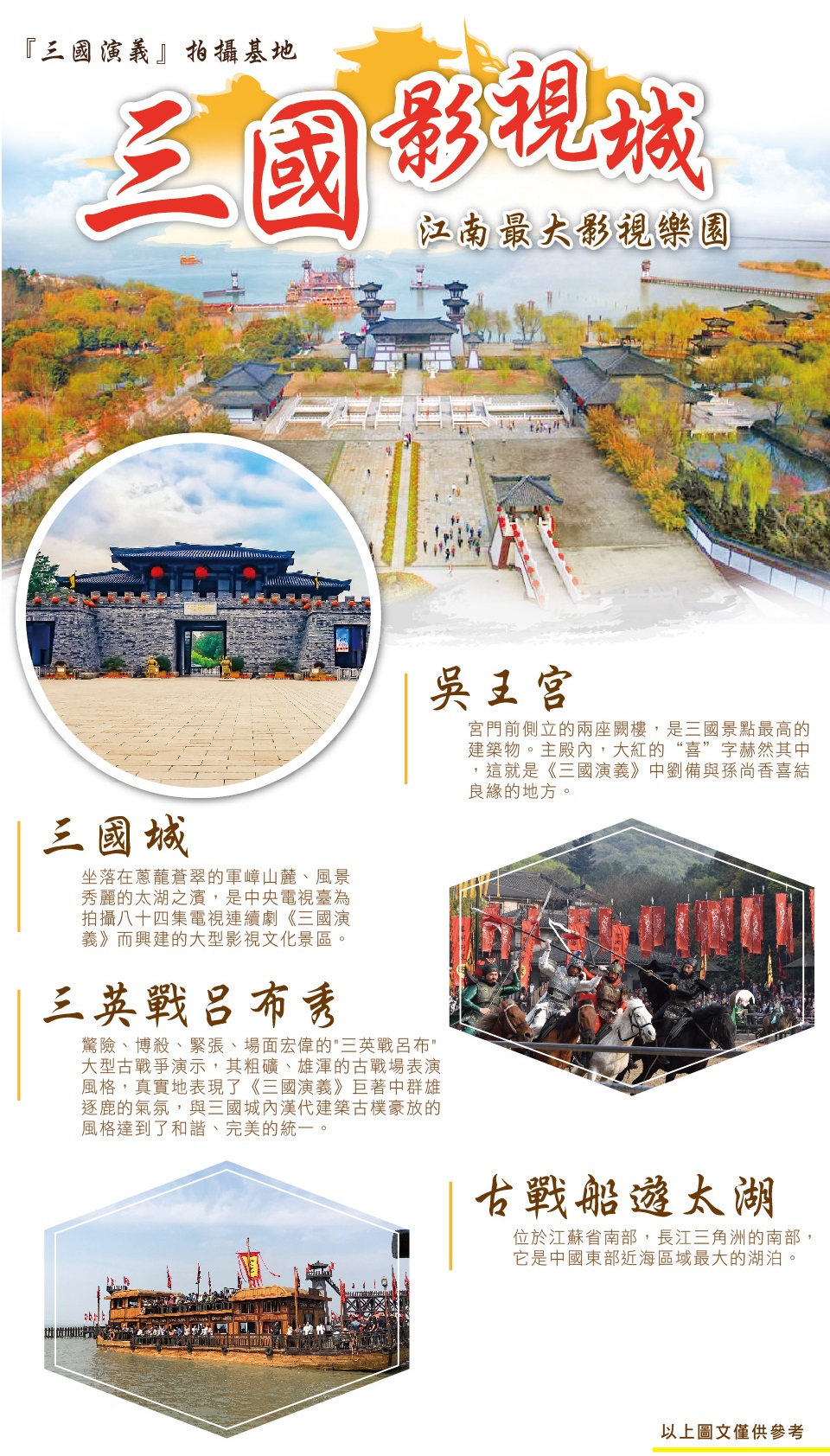 【三國城影視城】坐落在蔥蘢蒼翠的軍嶂山麓、風景秀麗的太湖之濱,是中央電視臺為拍攝八十四集電視連續劇《三國演義》而興建的大型影視文化景區,“劉備招親”、 “火燒赤壁”、“橫槊賦詩”“草船借箭”、“借東風”、“諸葛弔孝”、“舌戰群儒”等十多集的重場戲均在此拍攝。占地35頃是中視股份繼唐城景區之後推出的又一座集影視拍攝、旅遊功能於一體的影視城。