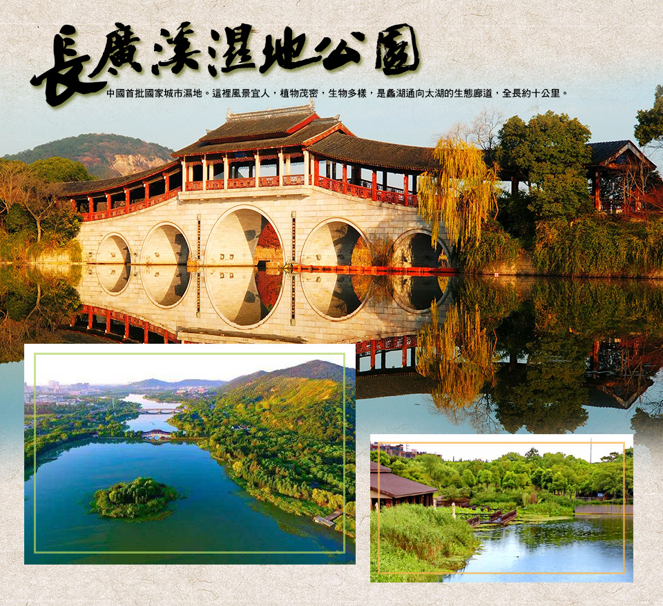 【長廣溪濕地公園】長廣溪國家城市濕地公園位於無錫市區西南部,南接太湖,北連蠡湖。這裏水面開闊,風景宜人,植物茂密,生物多樣。它是蠡湖通向太湖的生態廊道,全長約十公里,呈南北走向,是2005年5月國家建設部首批公佈的九個國家城市濕地公園之一,屬淡水河流濕地。