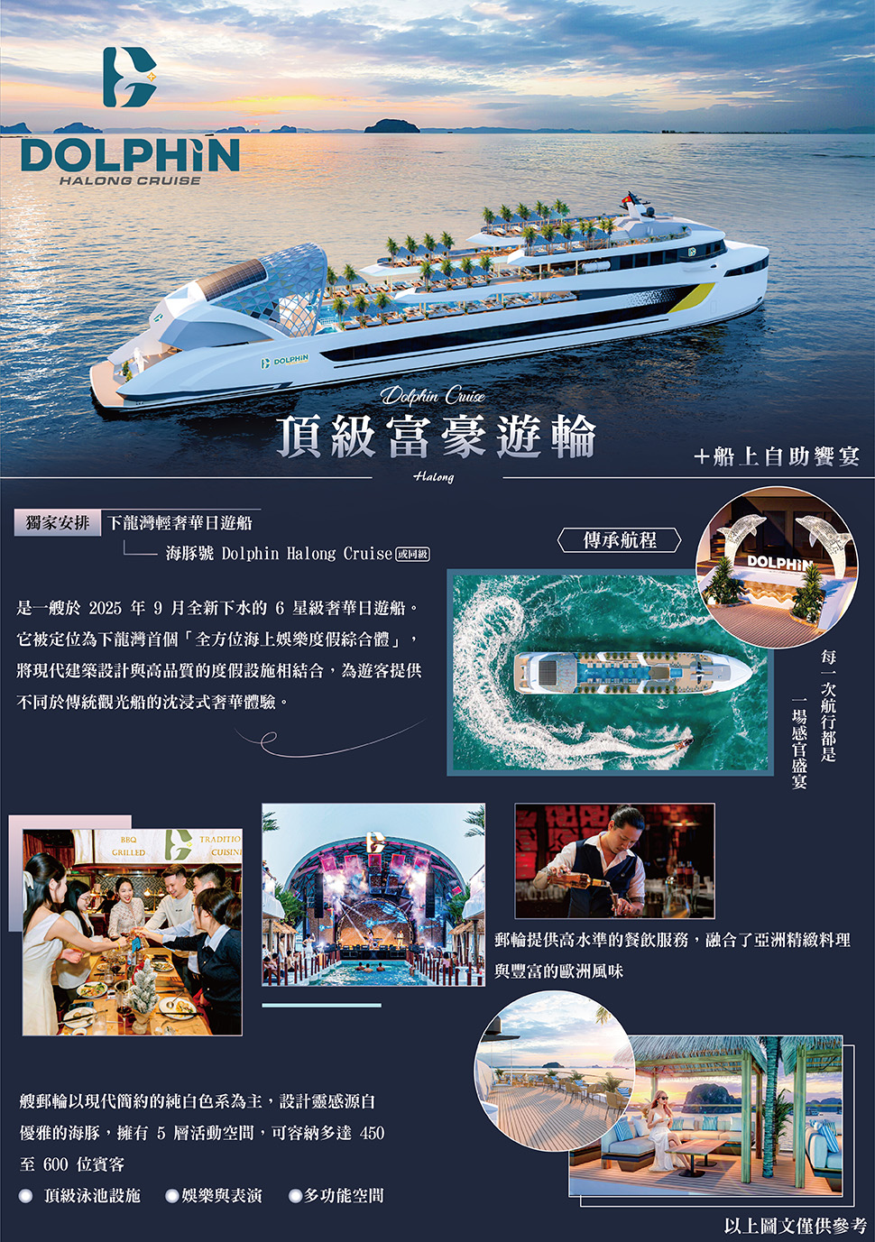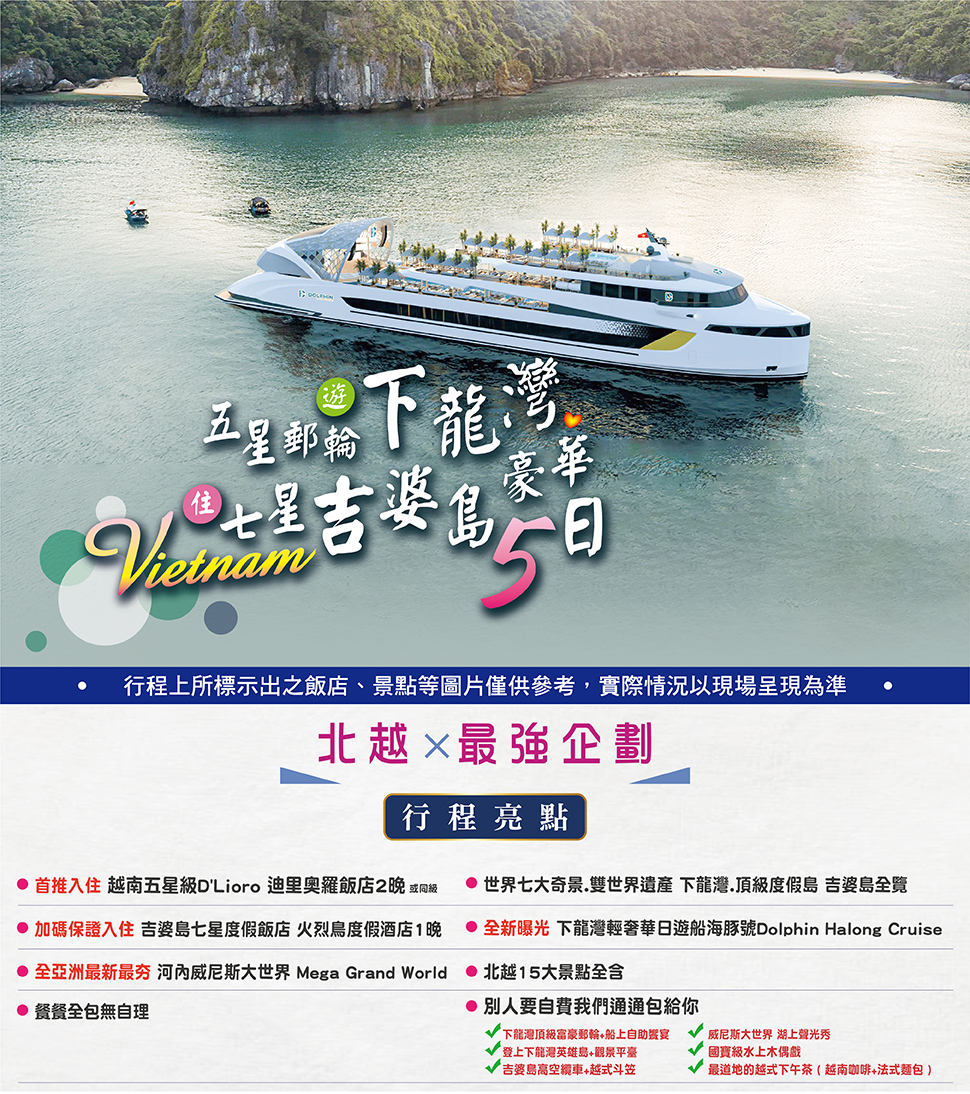 註 3:本行程以搭乘「海豚號(Dolphin Halong Cruise)」為主,如遇客滿或其他不可抗力因素,將改以同等級遊船替代,船上餐食亦將依實際所搭乘遊船之安排為準。此為團體作業亦無法指定特定船班,敬請理解。