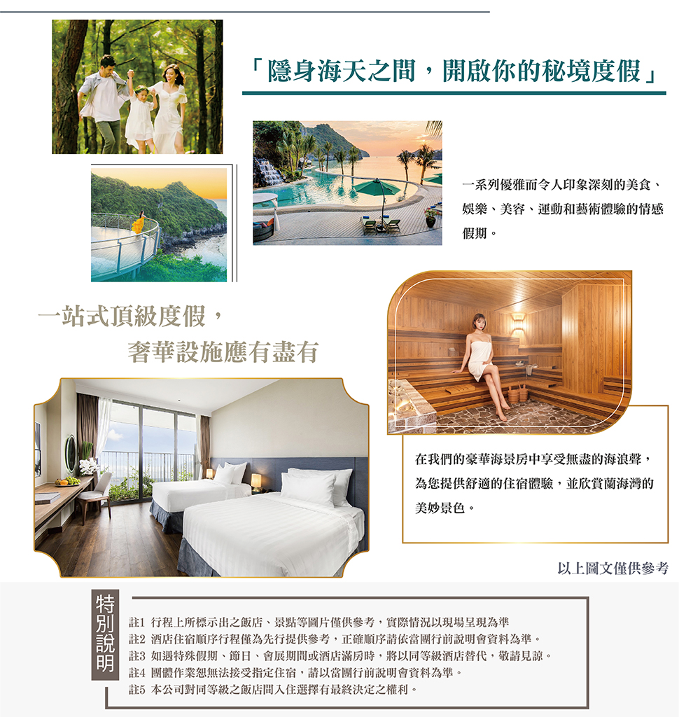 註 1:下龍灣遊船行程僅供參考,若遇當時天候不佳,如:颱風、大霧等狀況影響到安全,碼頭管制遊船,無法出海,而行程有所變更,敬請見諒。