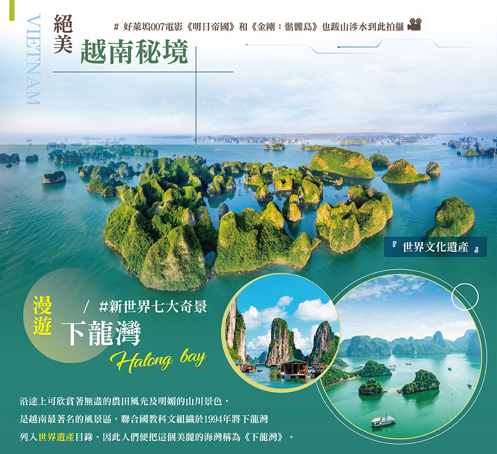 【下龍灣 Halong bay】往《下龍灣》沿途上可欣賞著無盡的農田風光及明媚的山川景色,是越南 最著名的風景區,聯合國教科文組織於 1994 年將下龍灣列入世界遺產目錄。由於下龍灣中的小島 都是石灰岩的小山峰,且造型各異,景色優美;下龍灣又名海上桂林,奇山怪嶼尤勝普吉攀牙灣。根據越南的神話傳說,很久以前,有一條母龍降落在這個海灣,擋住了洶湧的波濤,使這一帶人民安居樂業,因此人們便把這個美麗的海灣稱為《下龍灣》。
