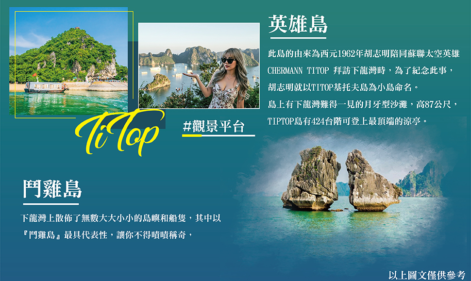 【英雄島TITOP】此島的由來為西元1962年胡志明陪同蘇聯太空英雄CHERMANN TITOP拜訪下龍灣時,為了紀念此事,胡志明就以TITOP基托夫島為小島命名,此島開始聲名大噪。TITOP島有下龍灣難得一見的月牙型沙灘,它的高度87公尺,我們可以登上英雄島424臺階,登上最頂端的涼亭,就是申請世界自然遺產照片的最佳取景處。