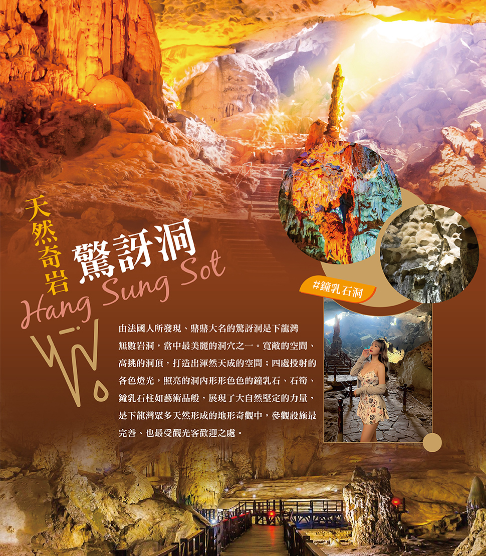 【驚訝洞Sung Sot Cave】下龍灣最漂亮的石灰岩洞之一,從下船處得登上138階梯才到入口,這是個規模十分龐大的石灰岩洞,洞頂上自然形成的小圓穴,高挑的洞頂、寬敞的空間,打造出渾然天成的空間,四處投射的各色燈光,照亮的石柱石筍以及岩壁,便如藝術品一般,將巨大的溶洞妝點得有如大自然的展演場,而洞內形形色色的鐘乳石、石筍、鐘乳石柱,數量大得驚人,展現了大自然的力量。