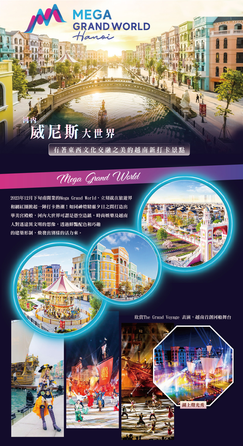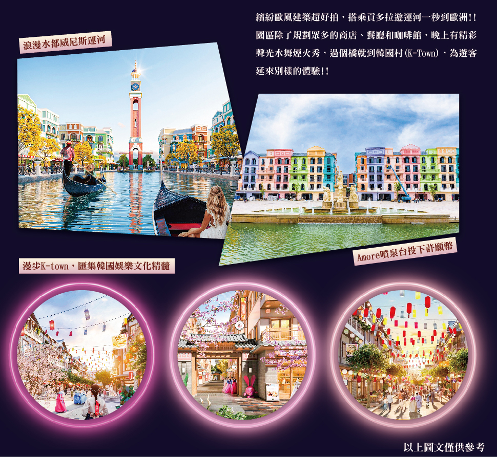 【河内威尼斯大世界Mega Grand World】二○二三年十二月下旬甫開業的(Mega Grand World),立刻就在旅遊界和網紅圈掀起一陣打卡熱潮!就如同神燈精靈夕日之間打造出華美宮殿般,河內大世界可謂是憑空造鎮,佔地廣袤的景區綰集了歐陸精華、時尚娛樂以及越南人對遙遠異文明的想像,透過鮮豔配色和巧趣的建築形制,煥發出別樣的活力來。其中率先落成的威尼斯區,除了規劃有為數眾多的商店、餐廳和咖啡館,更著意開鑿出運河水道,遊客因而得以乘坐浪漫的貢多拉御水前行,一面賞覽夾岸繽紛的建築群落,一面調整鏡頭角度、隨時抓拍取景:鐘樓與噴泉,橋樑與廣場,河內大世界的每一個小角落均相當出片,絕對適合熱戀情侶檔、三五好友或闔家老小快樂共遊。抵臨運河盡頭,一座東西向步行橋又將隔鄰的K-Town區連接起來──K-Town區以朝鮮古民居為靈感,結合傳統文化(硬體)和當代韓流(軟體),為遊客延來別樣的體驗,不僅設法復刻江南Style的流行風尚,也從側面烘托出「泡菜歐巴」在中南半島上所掀起的強勁旋風。