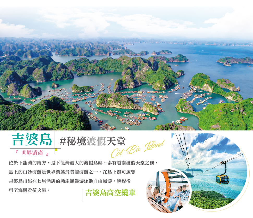 【吉婆島】位於下龍灣的南方,是吉婆群島中最大的島嶼,吉婆島上的白沙海灘分別被命名為吉婆島 1 號(Cat Co 1) 、吉婆島 2 號(Cat Co 2)、吉婆島 3 號(Cat Co 3) ,其中吉婆島 2 號海灘最清靜也 最吸引人,還提供簡單的住宿和露營,1 號和 3 號海灘正在修建旅遊度假村。在島上遊覽吉婆島集市在七星酒店的懸崖無邊游泳池自由暢游,晚餐後可至海邊看螢火蟲或者在酒店小憩享受極致的人生。