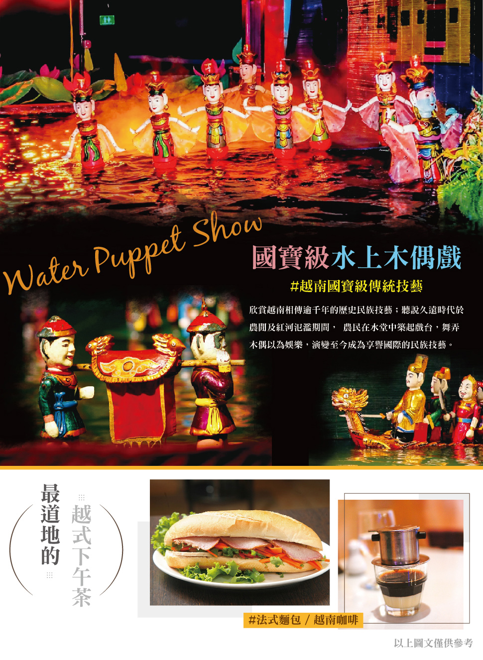 【國寶級水上木偶戲】欣賞越南相傳逾千年的歷史民族技藝;聽說久遠時代於農閒及紅河氾濫期間,農民在水堂中築起戲台,舞弄木偶以為娛樂,演變至今成為享譽國際的民族技藝。