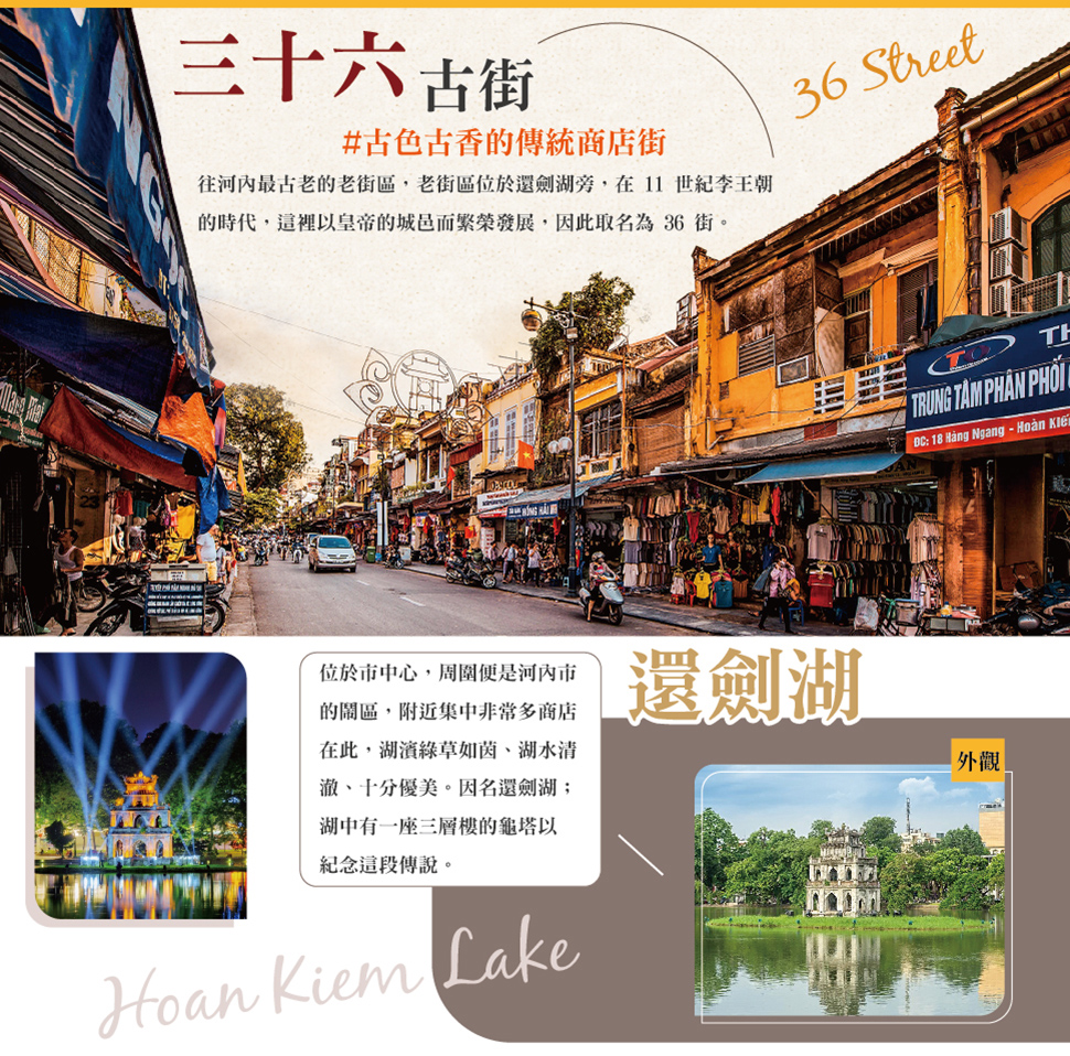【三十六古街】往河內最古老的老街區,老街區位於還劍湖旁,在 11 世紀李王朝的時代,這裡以皇帝的城邑而繁榮發展,因此取名為 36 街,每一條狹窄的街道均以當時交易的商品來命名,如絲街、米街、紙街、珠寶街等,在此千年歷史的舊街區內遊逛時,你可看到多個世紀內進行的商品買賣活動至今仍不曾改變瀏覽這古色古香的傳統商店街。
