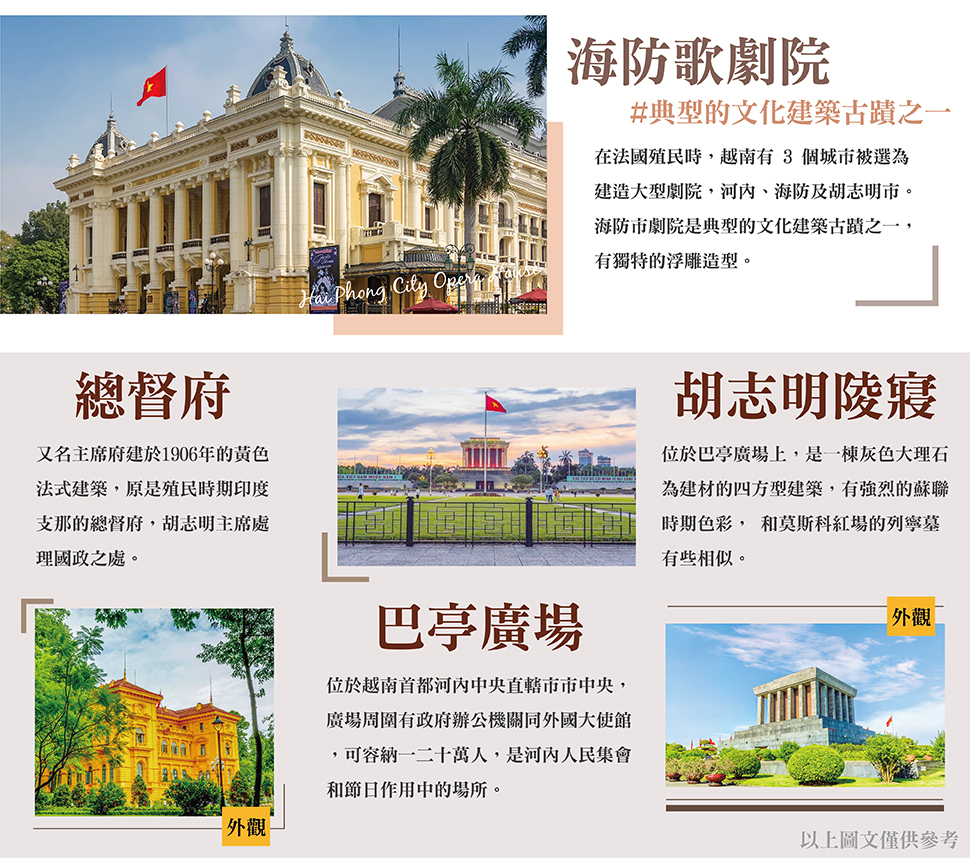 【海防歌劇院】在法國殖民時,越南有 3 個城市被選為建造大型劇院,河內、海防及胡志明市。海防市劇院是典型的文化建築古蹟之一,有獨特的浮雕造型。歌劇院周圍有大型公園和商業場所。劇院前的活動空間大,所以也是承辦許多大型活動的地方。歌劇院前還有噴泉廣場,更是許多市民活動的熱門地點之一。
